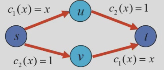 - 道路 \(su\) 和 \(vt\) 的通行时间函数为 \(c_1(x)=x\),道路 \(sv\) 和 \(ut\) 的通行时间函数为 \(c_2(x)=1\)