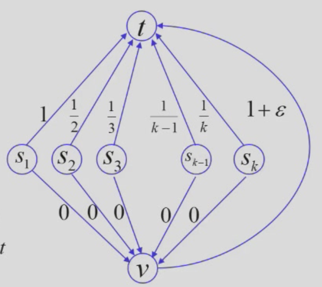 - 从所有使用者整体利益来看,使用者 \(i\) 选择 \(s_i-v-t\) 最优,总费用是 \(1+\epsilon\)