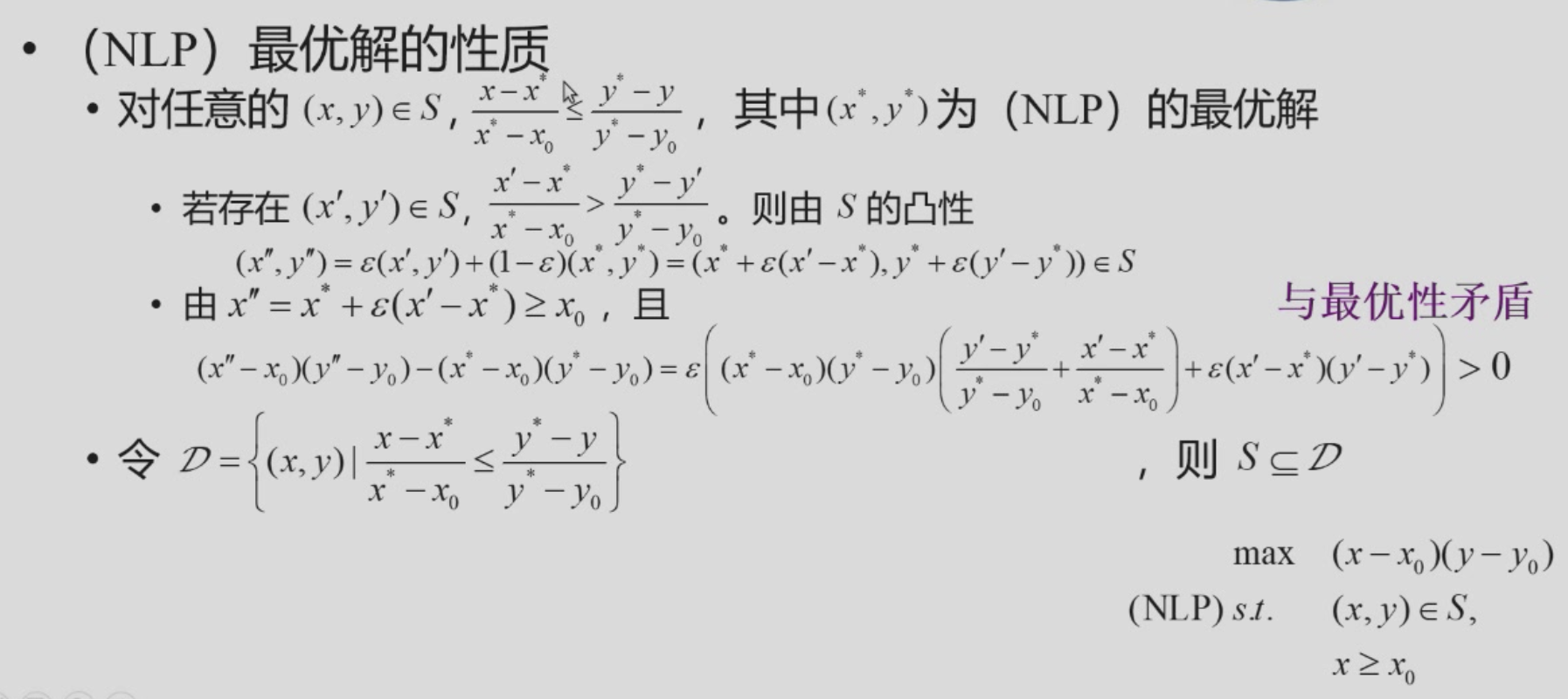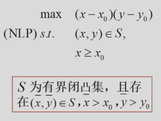 存在性:由 \(S\cap\{(x,y)|x\geq x_0\}\) 为有界闭集,二元连续函数 \((x-x_0)(y-y_0)\) 的最大值存在