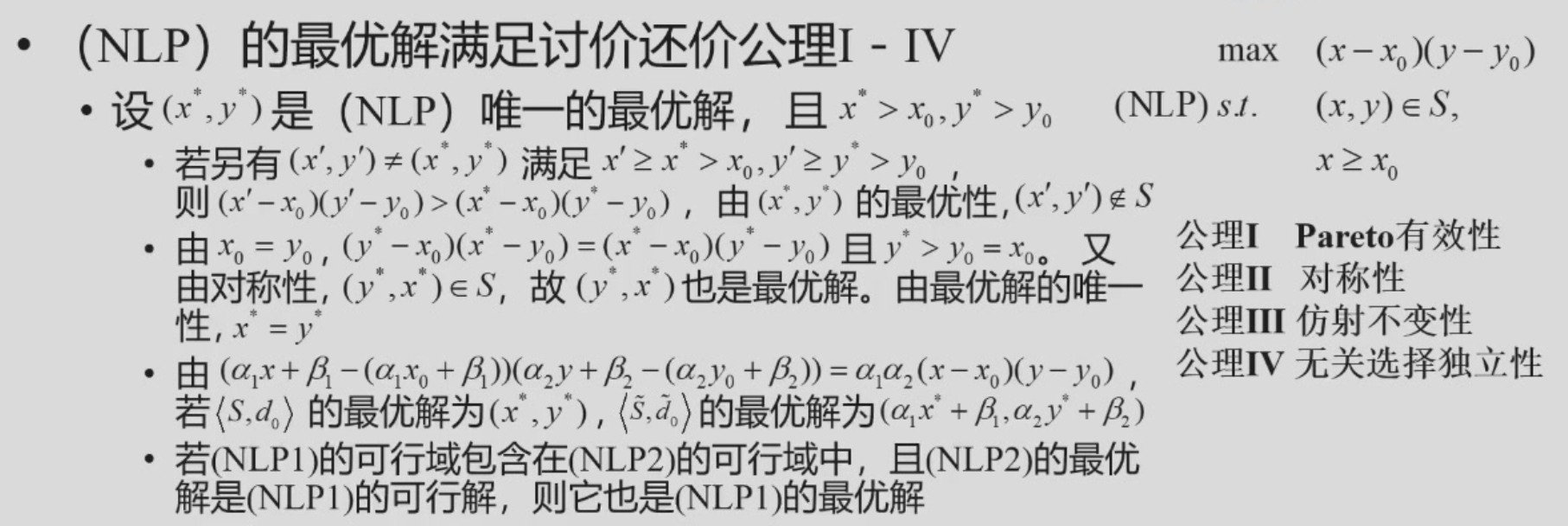 - Nash 应用公理化思想,首次给出了讨价还价问题的一种解- 至少存在一 \((x,y)\in S\),使得 \(x>x_0\) 且 \(y>y_0\)