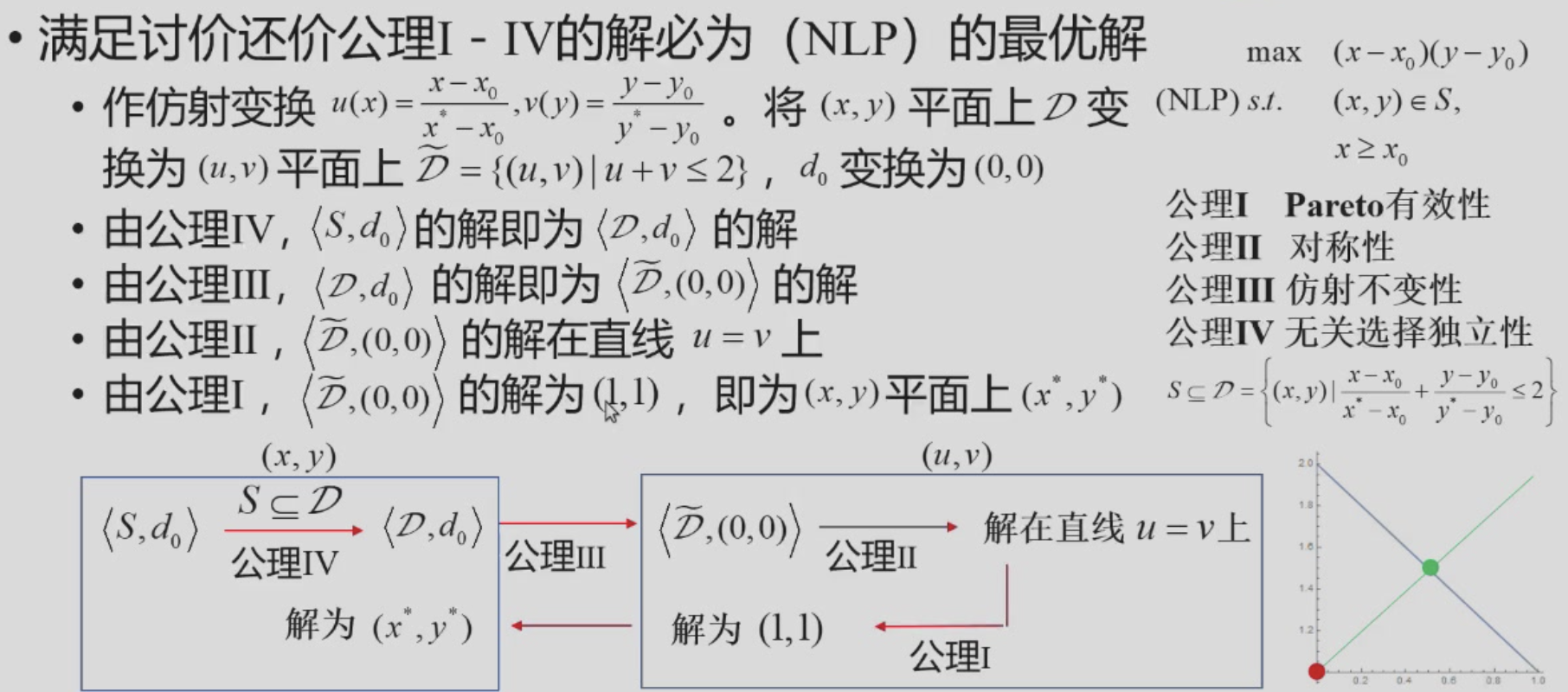 讨价还价问题满足以上四条公理的解是唯一的,即为非线性规划(NLP)的最优解