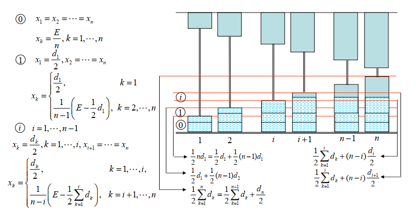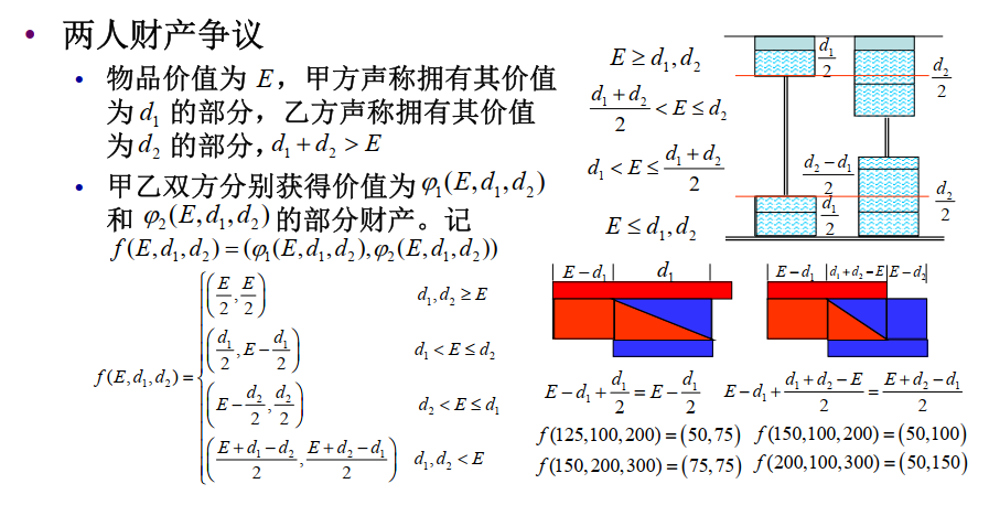 - 设债权人 \(i\) 的债务额为 \(d_i,i=1,...,n\),剩余资产为 \(E,E<\sum\limits_{i=1}^nd_i\)。记 \(\mathbf{d}=(d_1,...,d_n)\) 。一个破产清偿问题可用 \(<E,\mathbf{d}>\) 来表示