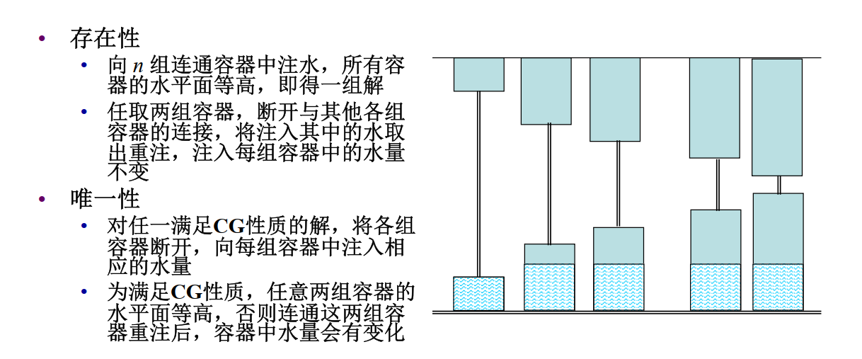 - 破产清偿问题满足 CG 性质的解存在且唯一- CG:\(f(x_i+x_j,d_i,d_j)=(x_i,x_j),i,j=1,...,n,i\not=j\)