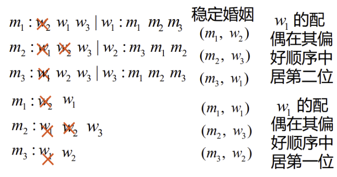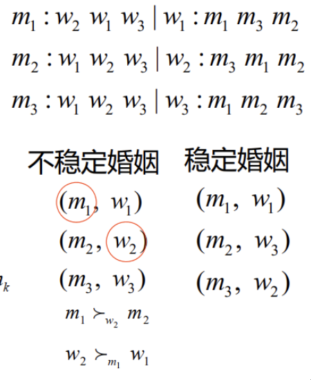 - \(n\) 名男士 \(m_1,m_2,...,m_n\) 和 \(n\) 名女士 \(w_1,w_2,...,w_n\),每位男(女)士有一偏好顺序可对所有女(男)士按其满意度进行排序