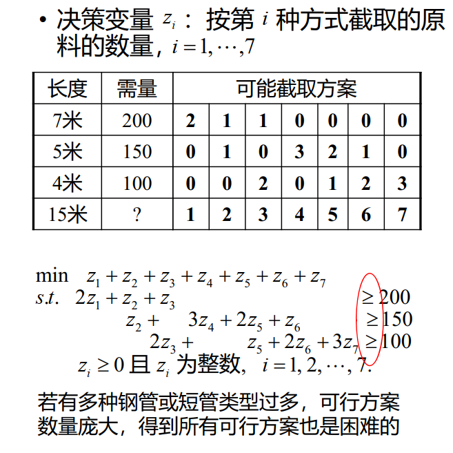 - 每种短管截取的数量不低于需求量,即 \(\sum\limits_{j=1}^nx_{ji}\geq b_i,i=1,2,⋯,k\)