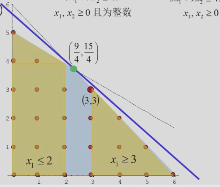 由于最优解不是整数解,我们将松弛问题的可行域分为 \(x_1\geq 3,x_1\leq 2\) 两个子可行域。