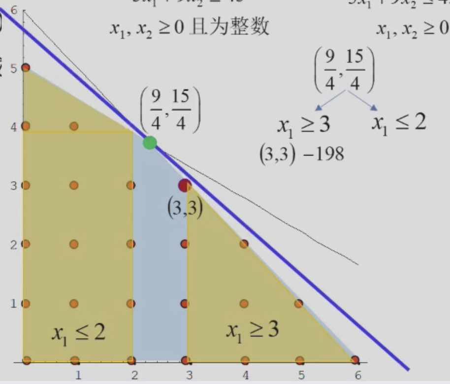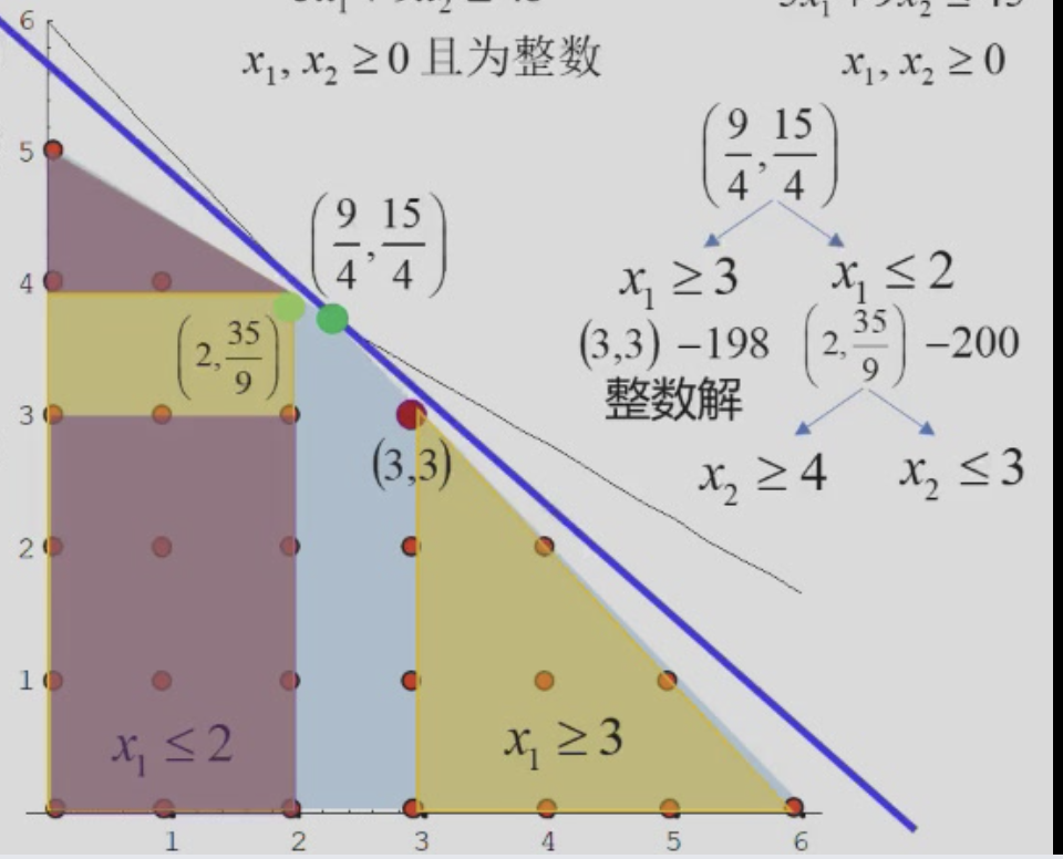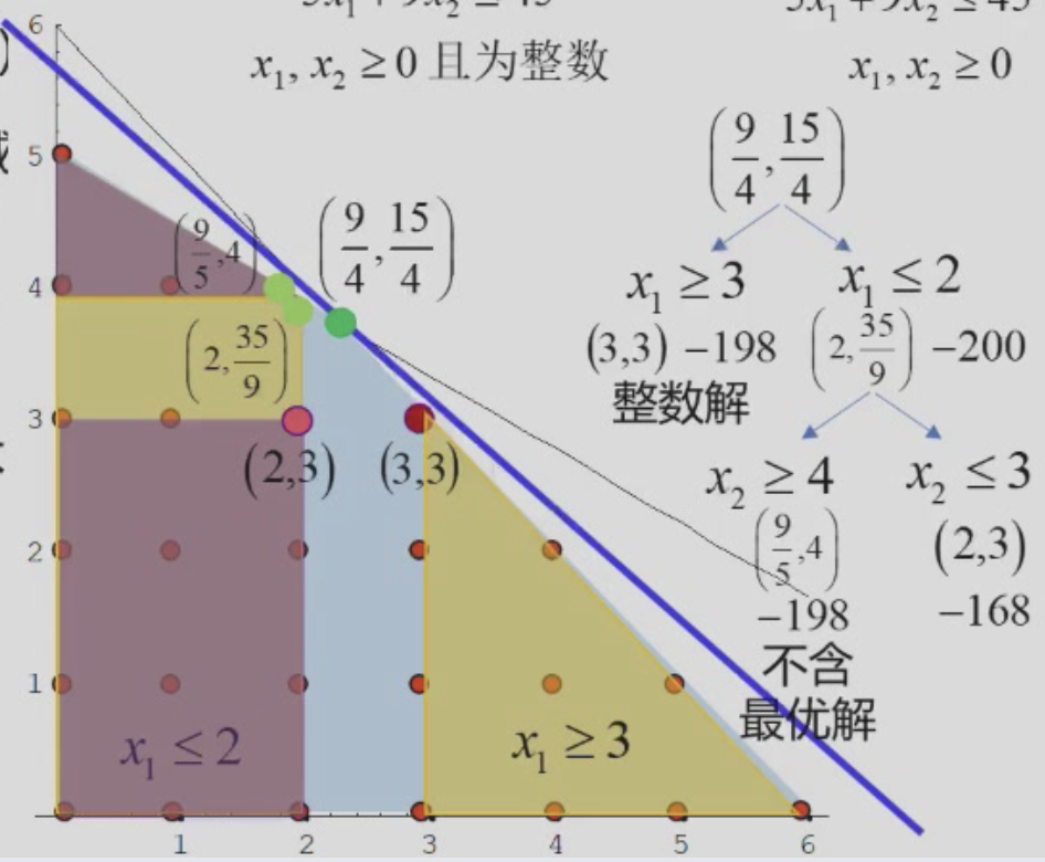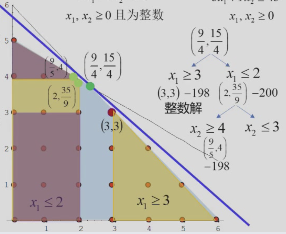 - 若最优解不是整数解,则将松弛问题的可行域分为两个子可行域,分别求解这两个子问题