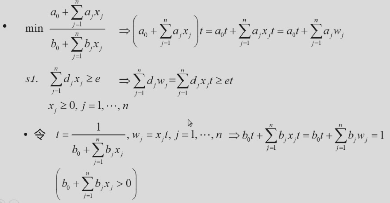 - 线性分式规划(linear fractional programming):目标函数为两个线性函数的商,约束条件为线性等式或不等式