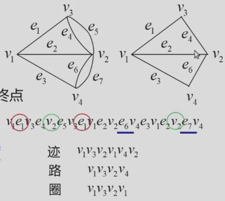 - 顶点和边交替出现的序列 \(v_{i_0}e_{i_1}v_{i_1}e_{i_2}...e_{i_k}v_{i_k}\),且序列中与每条边相邻的两个顶点为该边的两个端点,称为连接顶点 \(v_{i_0}\) 和 \(v_{i_k}\) 的途径(Walk)