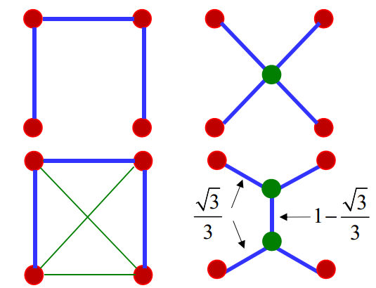 允许增加任意多个 Steiner 点的最短连接(就是说,可以在原有的点集中增加任意多个点,使得最后的连接线段总长度最短)