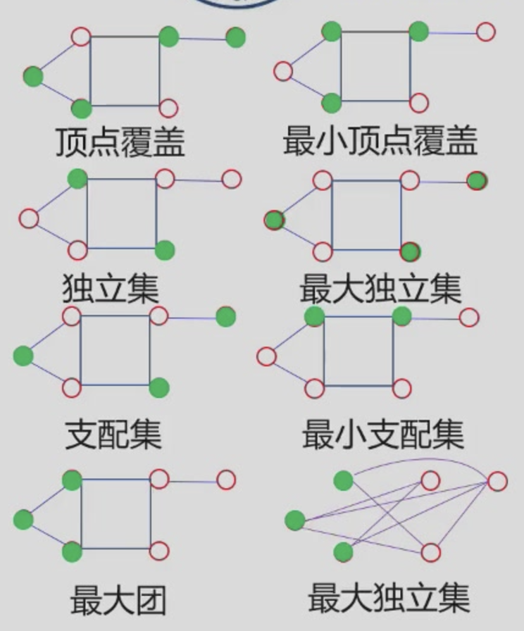- 支配集:\(V\) 的子集 \(S\) 称为 \(G\) 的支配集(Dominated Set),若任意 \(S\) 中顶点均与某个 \(V\backslash S\) 中顶点关联