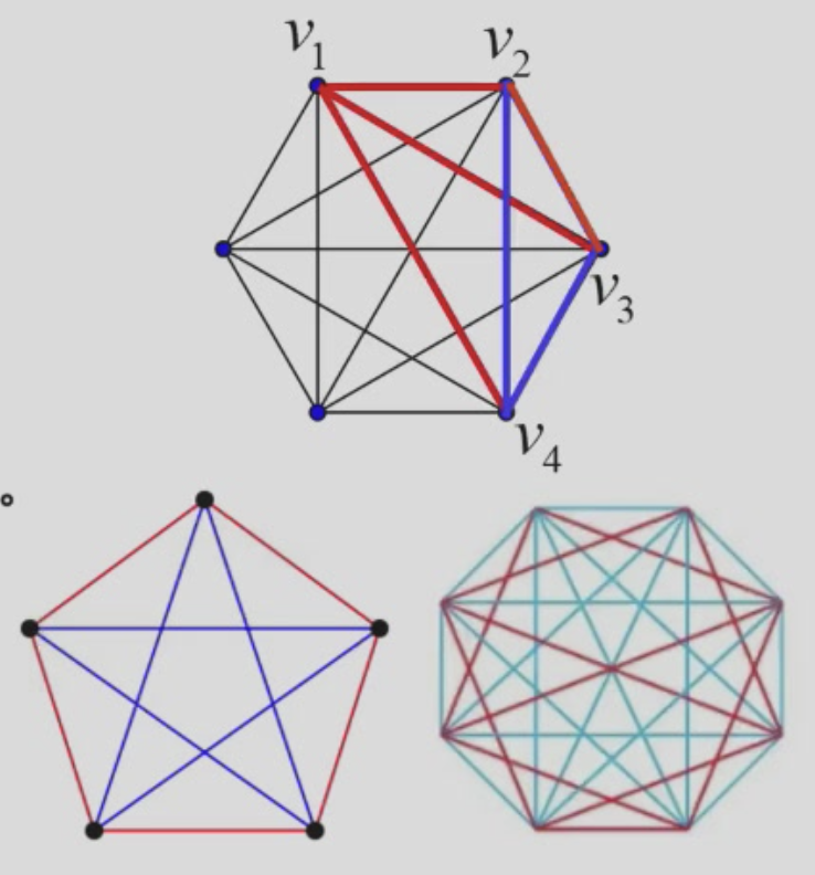 - 用红、蓝两种颜色对完全图 \(K_6\) 的边进行着色,每条边着两种颜色的一种,着色后的图中要么存在一个边全是红色的团 \(K_3\),要么存在一个边全为蓝色的团 \(K_3\)