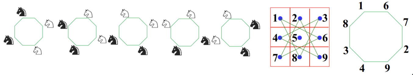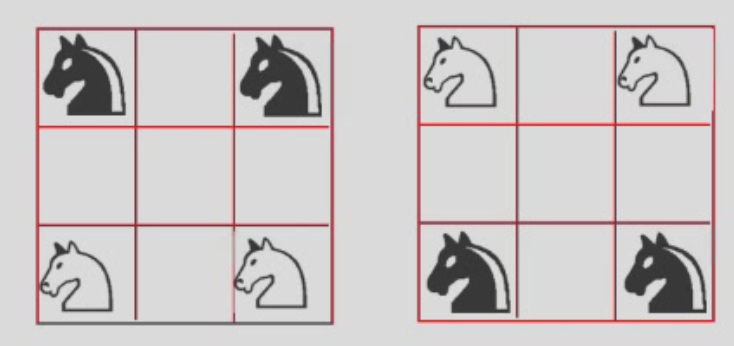 一 3*3 方格棋盘,第一行左、右两个方格各置一匹黑马,第三行左、右两个方格各置一匹白马,按国际象棋中马的走子规则,如何用最少的步数将黑马白马的位置互换