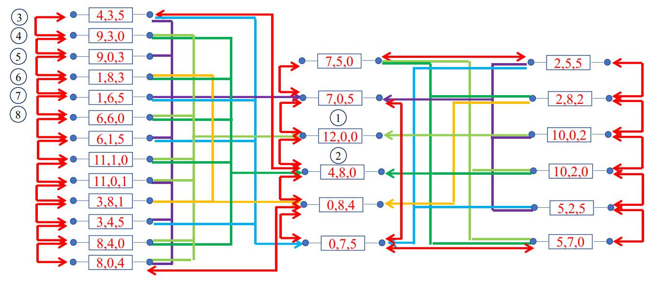 - 构造有向图 \(G=(V,E)\),其中顶点集 \(V\) 为所有可能状态的集合,弧 \((\alpha,\beta)\in E\) 当且仅当可通过一次倾倒使状态由 \(\alpha\) 变为 \(\beta\)