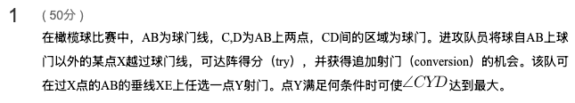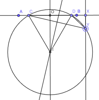 作过 C,Y,D 三点的圆,圆心记为 \(E\),要求 \(\angle CYD\) 最大,即要求 \(\angle CED\) 最大,由于 CD 长固定,即求 CE/ED 长最小值(即半径 EY 的最小值)