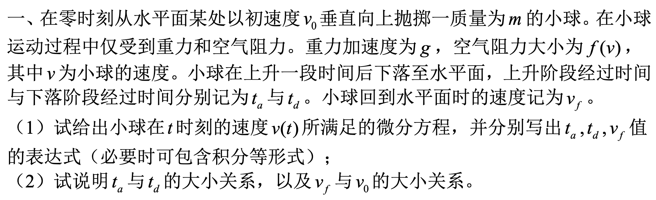 下降阶段同理受力分析得 \(t_d=\int_0^{v_f}\frac{mdv}{mg-f(v)}\)