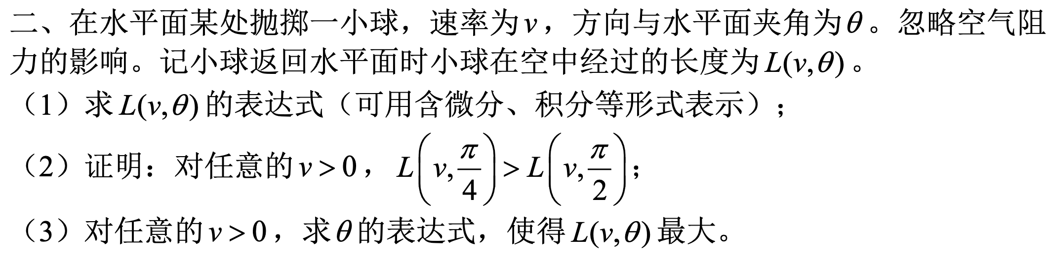 (3)\(\frac{\partial L}{\partial\theta}=\frac{v^2\cos\theta}{g}-\frac{2v^2\sin\theta\cos\theta}{g}\ln\frac{\cos\theta}{1-\sin\theta}+\frac{v^2\cos\theta}{g}=0\)