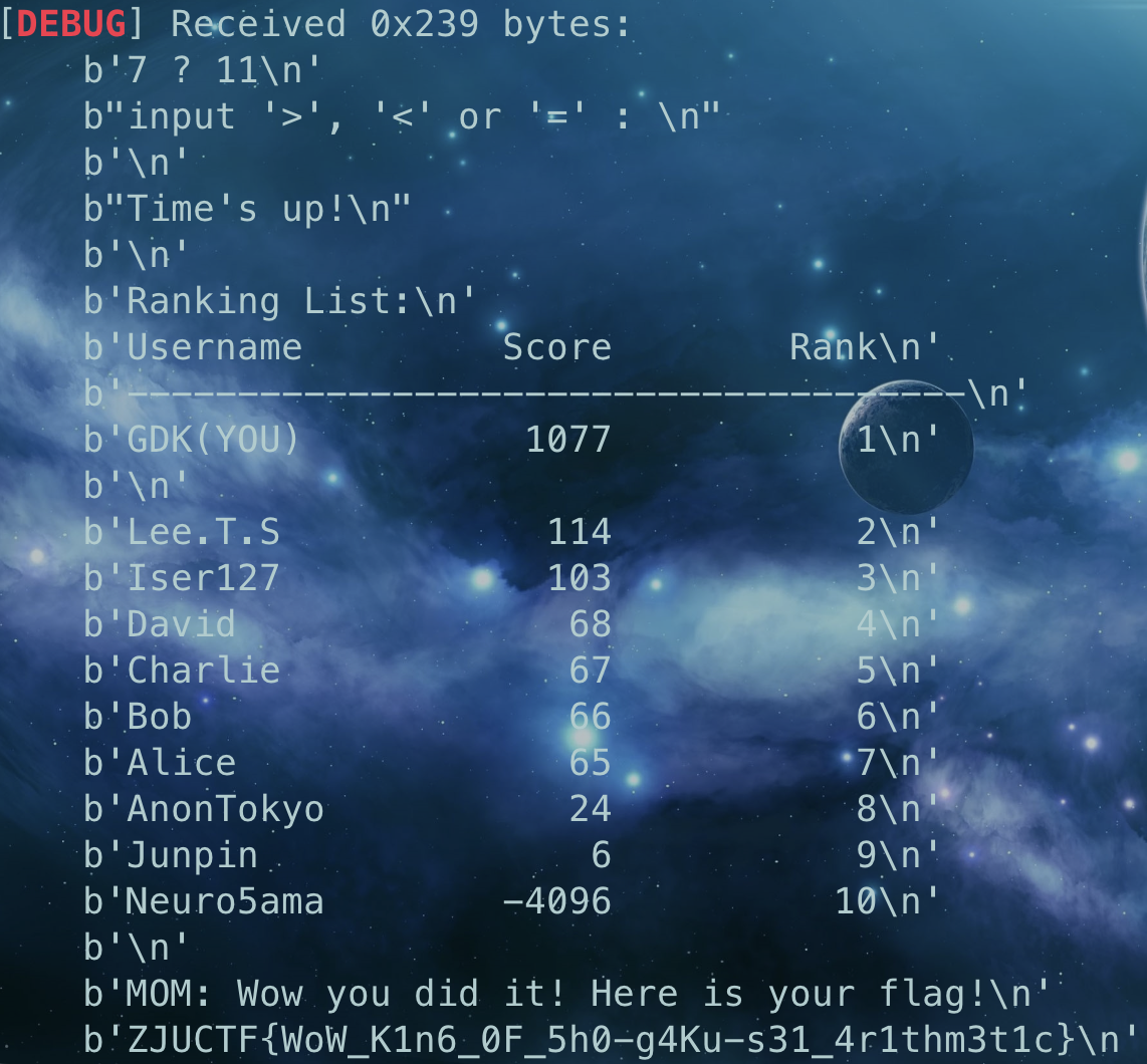 frompwnimport*fromwstubeimportwebsocketcontext.log_level='debug'p=websocket("wss://ctf.zjusec.com/api/proxy/ad8571c7-0b06-413e-b642-bce4169f40a1")p.recvuntil("Input your choice: ")p.sendline("1")p.recvline()p.recvline()i=0while(i<=10000):p.recvline()text=p.recvline()text=text.decode()p.recvuntil("input '>', '<' or '=' : ")index=text.find("?")a=int(text[:index-1])b=int(text[index+2:])if(a>b):p.sendline(">")elif(a<b):p.sendline("<")else:p.sendline("=")p.recvline()i+=1