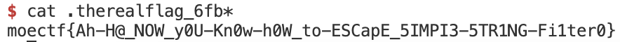 不知道为什么直接 cat 打不开文件,但是命令行通配符就可以打开(通配符即用 * 省略后面长长一串),即可得到 flag : moectf{Ah-H@_NOW_y0U-Kn0w-h0W_to-ESCapE_5IMPI3-5TR1NG-Fi1ter0}