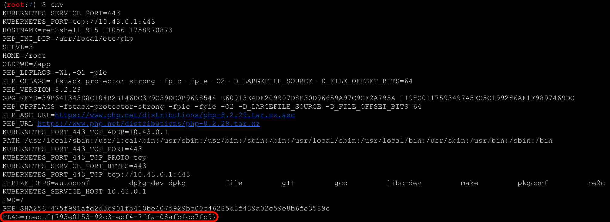 Web-12|第十二章 玉魄玄关·破妄¶ 📖 阅读信息 阅读时间:1 分钟 | 中文字符:73 碎碎念¶ 真恶心啊怎么还有人拿到 Shell 找不着 flag 的呢 Writeup¶ 访问一下网站会看到如下所示: 根据题目提示使用蚁剑,将 cmd 作为密钥: 进入 shell 中在环境变量中可以得到最终 flag: flag 为 moectf{793e0153-92c3-ecf4-7ffa-08afbfcc7fc9} 💬 评论 评论系统加载中...