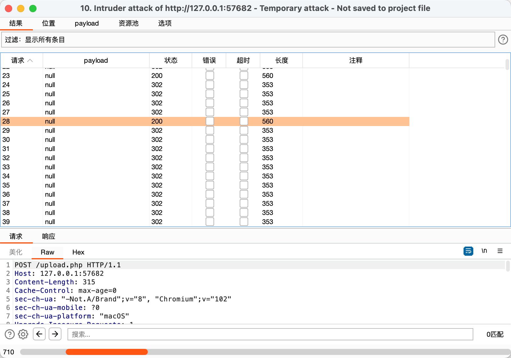 使用的是 Burp Intruder(Payload 设置成 Null Payload,然后循环发包),可以看到有些时候成功上传: