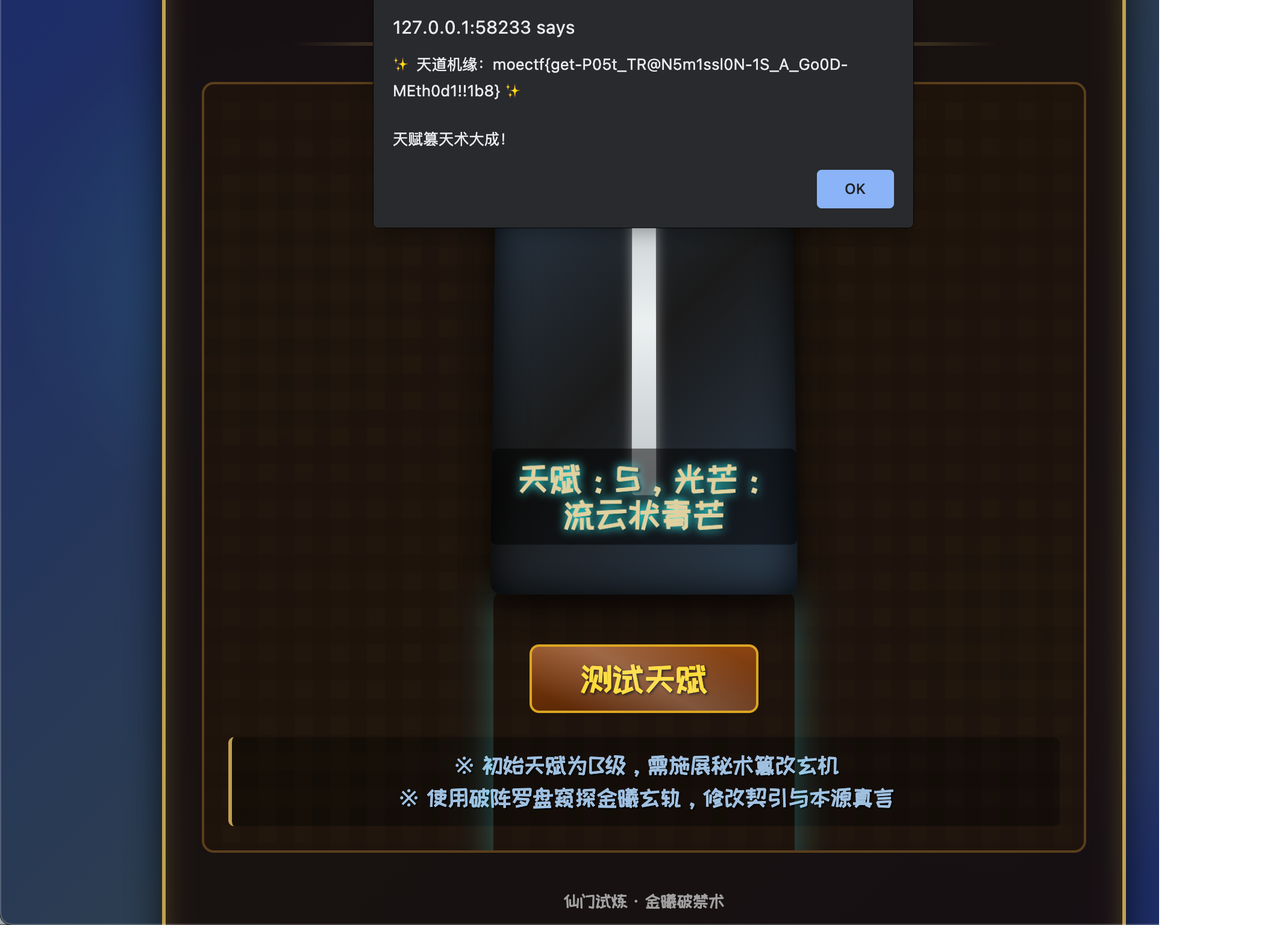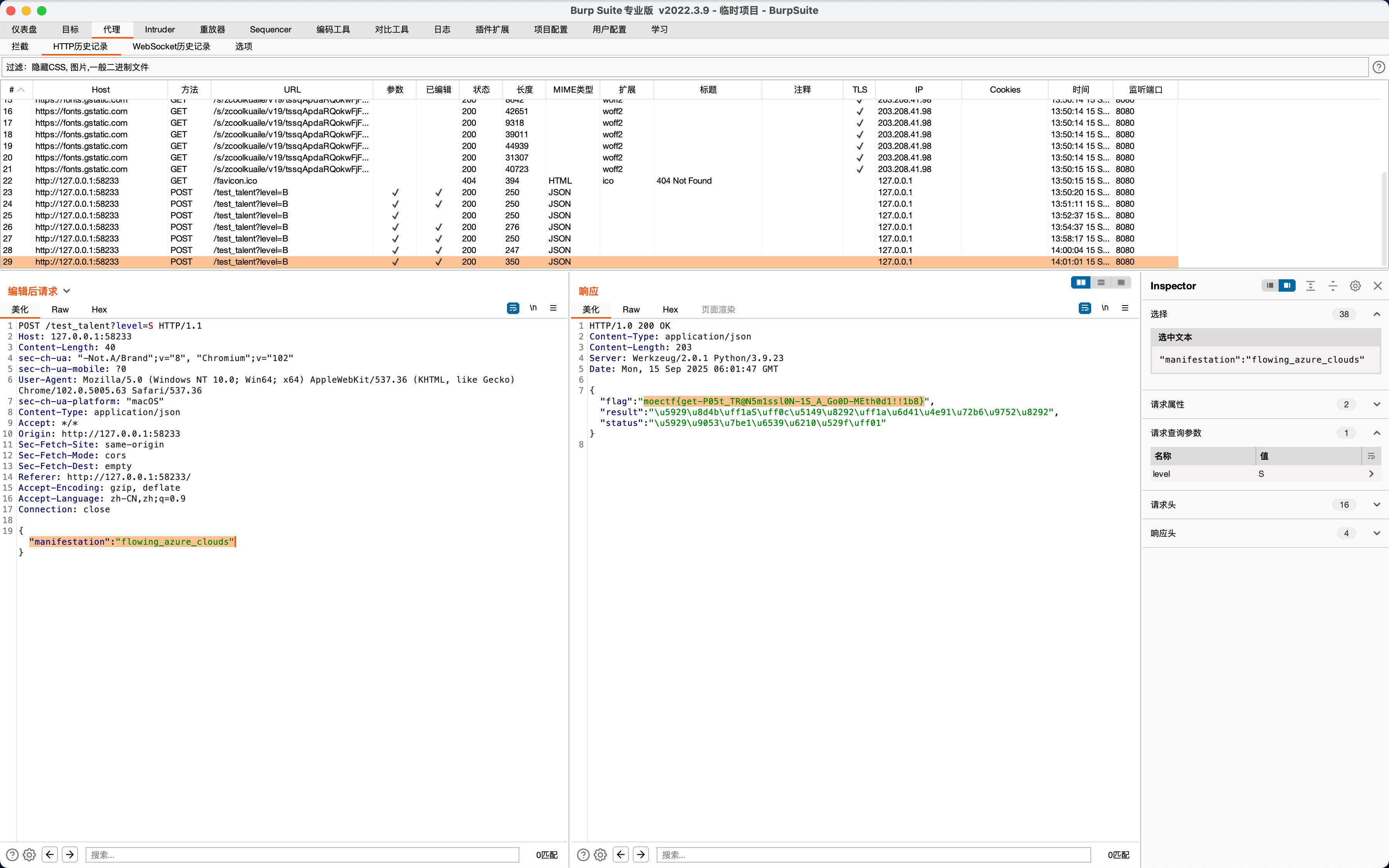 从题目意思很明显能看出需要我们进行数据包拦截和篡改,只要修改 POST 参数路由为 /test_talent?level=S,把请求包内的 json 中的 manifestation 改为 flowing_azure_clouds 即可获得 flag: