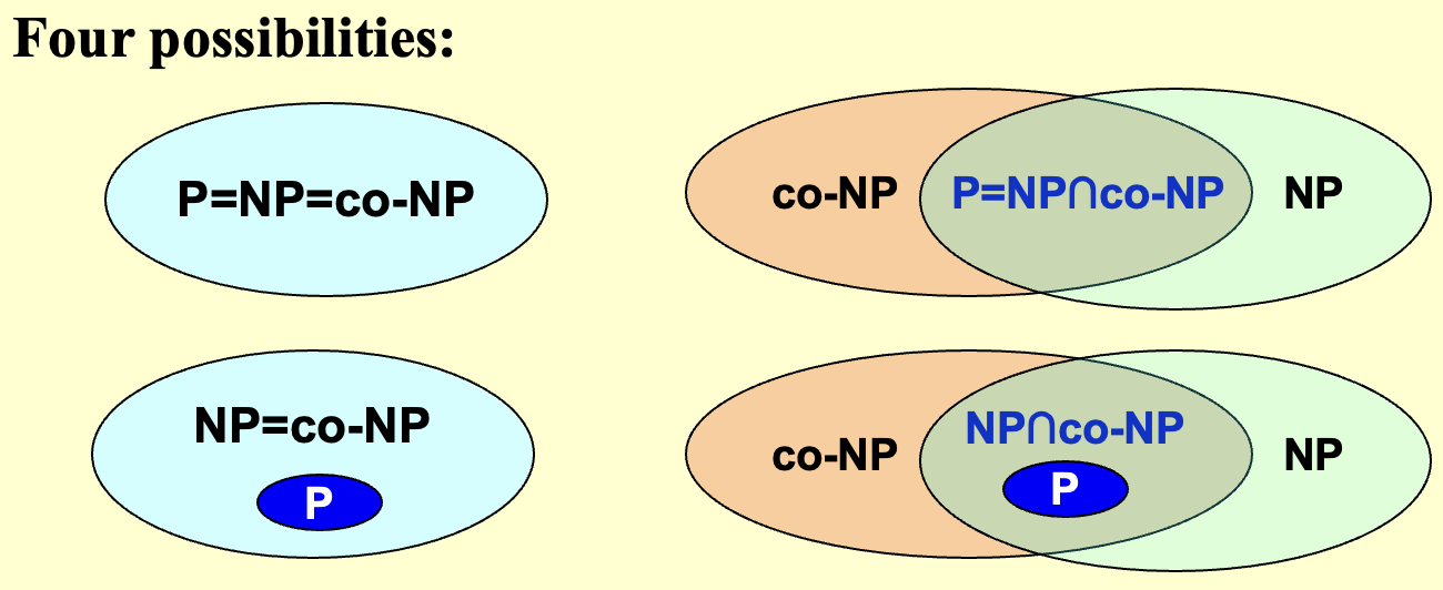 假如已知 \(L\in NP\),那么我们是否能够得出 \(\overline{L}\in NP\) 的结论(这类问题被称为 co-NP 问题)呢?目前有以下四种猜想:
