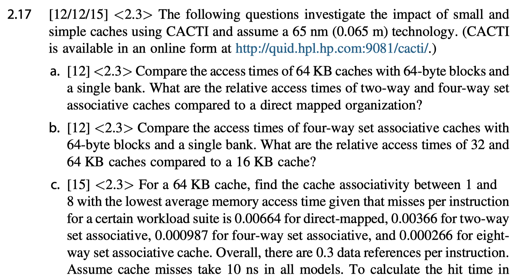(a)直接映射的访问时间为 0.86ns,2 路组相联的访问时间为 1.12ns,4 路组相联的访问时间为 1.37ns