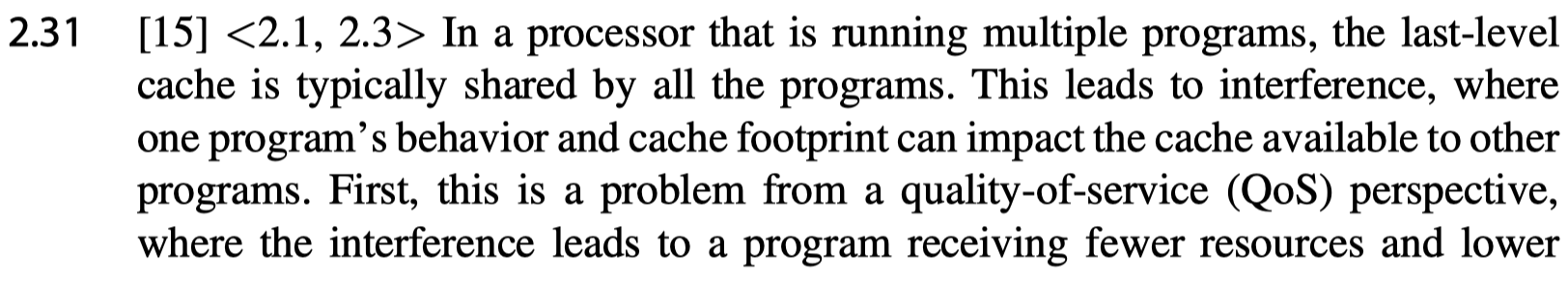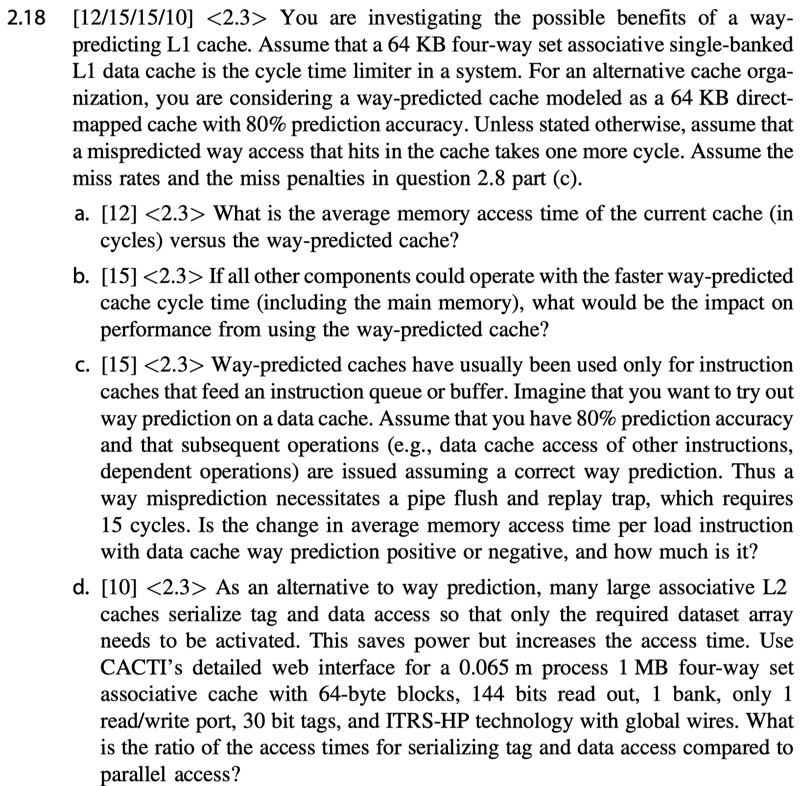 (c)原来的访问时间为 \(2.59\text{ cycles}\),如果是 15 个时钟周期的错误预测损失,访问时间为 \((1-0.022)\times (0.8\times 2+(1-0.8)\times 15)+0.022\times 20=4.94\text{ cycles}\),增加了 \(2.35\text{ cycles}\)
