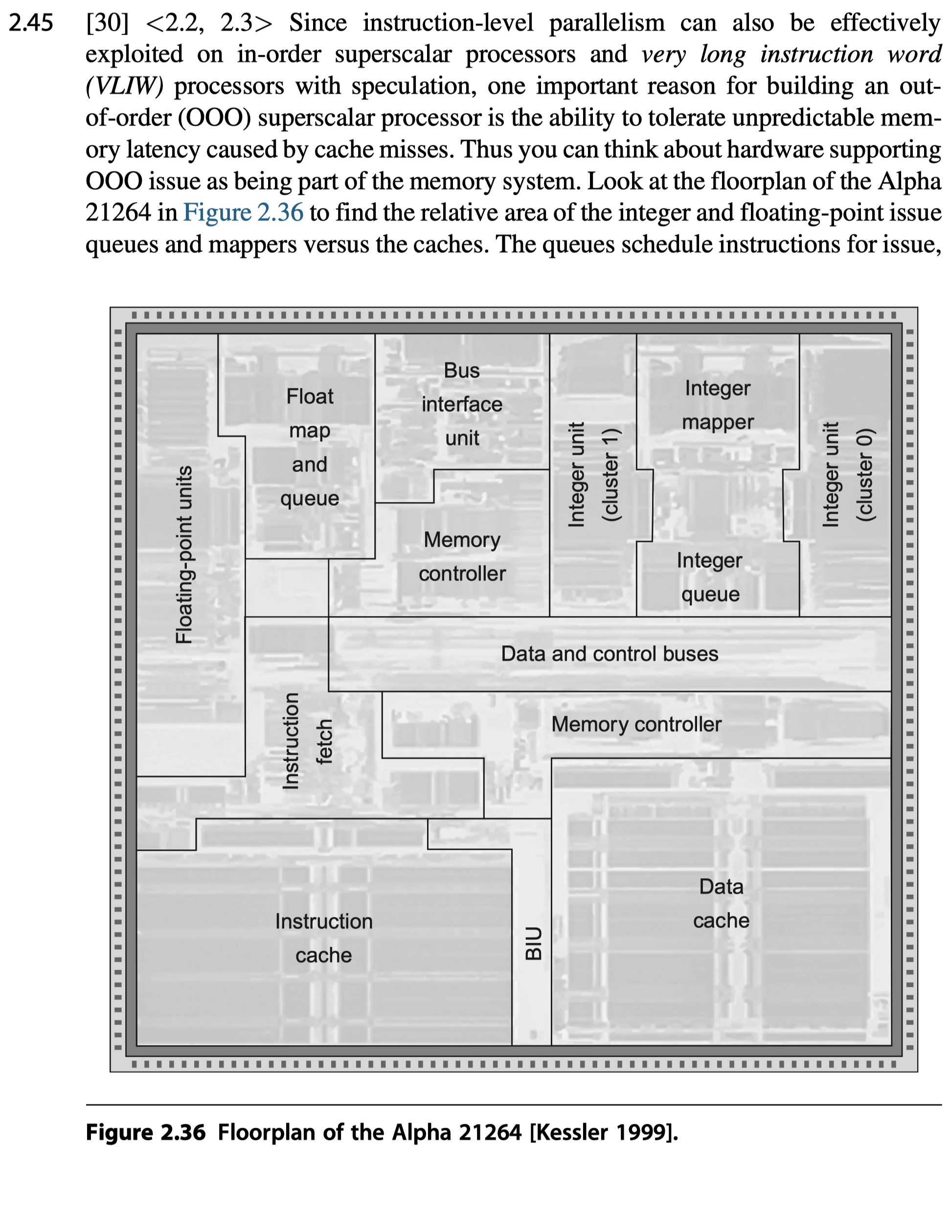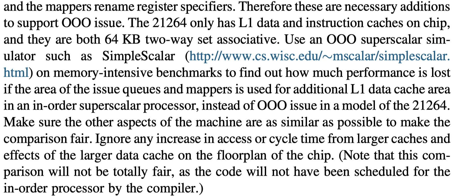 移除 Alpha 21264 中支持乱序执行的硬件(发射队列、重命名映射器)后,其释放的面积可将数据缓存从 64 KB 扩大至约 80 KB(假设OOO硬件面积占原数据缓存的25%)