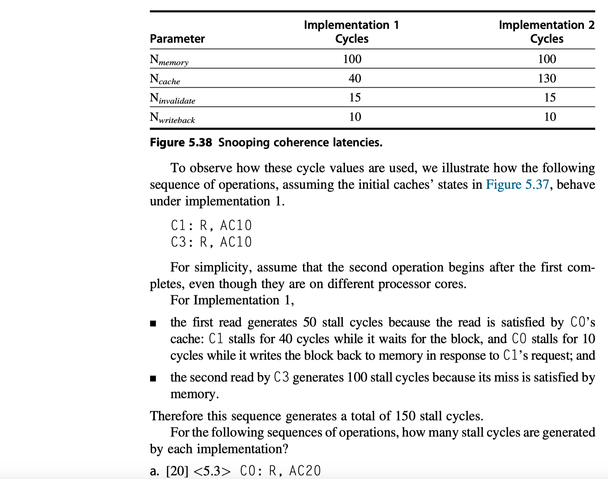 (a)第一条指令是满足 C3 的缓存,第二条指令是满足 C1 的缓存(带 Write-Back),第三条指令是满足内存的,所以实现 1 需要 200 个周期,实现 2 需要 380 个周期