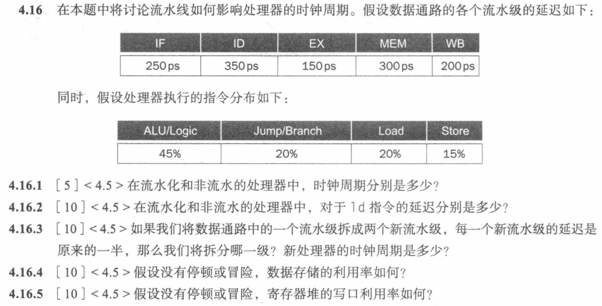 非流水化时钟周期 \(= 250 + 350 + 150 + 300 + 200=1250\text{ps}\) 流水化时钟周期 \(= 350\text{ps}\)