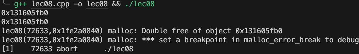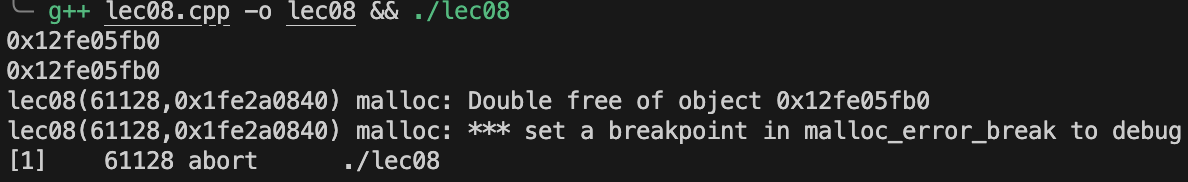 可以看到我们并没有写复制构造函数,这是 C++ 默认帮我们写好的,同时 p2 = p1 使用了复制构造,所以 p2 和 p1 指向同一块内存,导致 delete[] name 语句执行了两次,出现内存错误