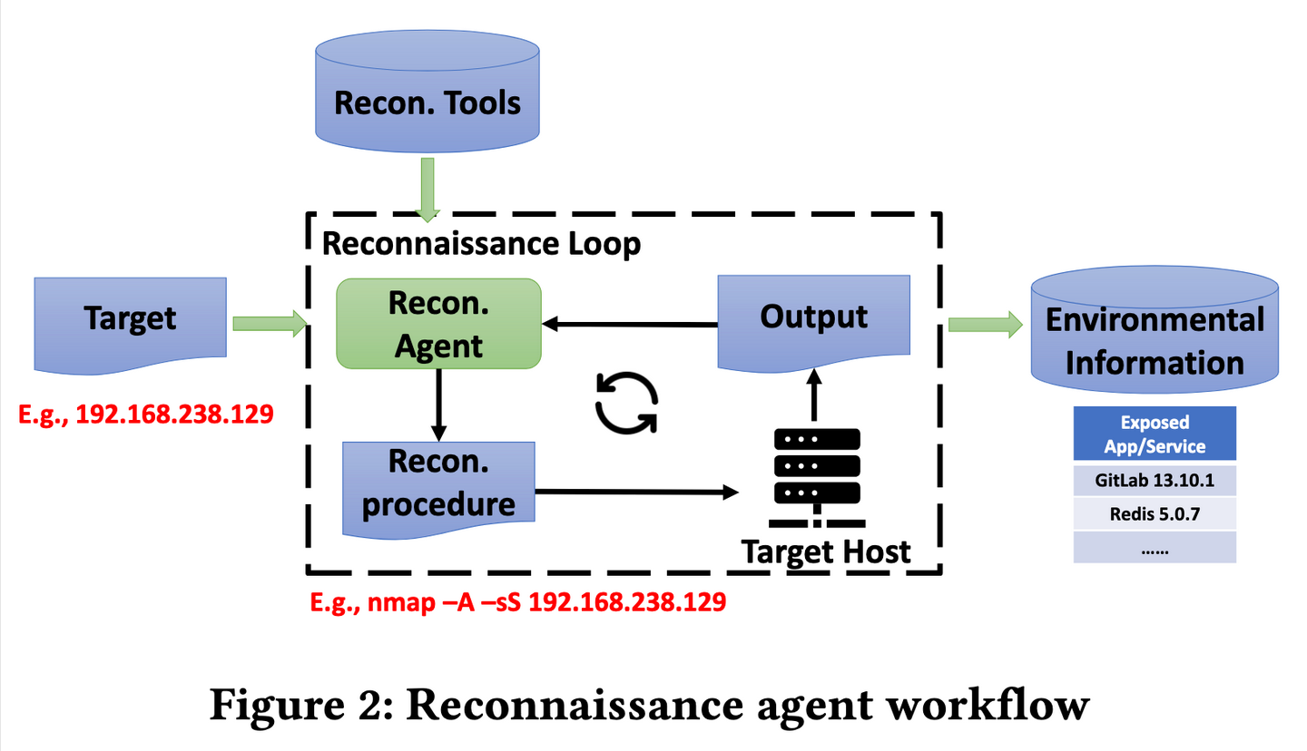 侦查 Agent 在一个自迭代循环中运行,生成侦察命令,从目标收集信息,并分析这些命令的结果,直到做出最大努力。一旦侦察循环结束,Agent 总结其发现并将其存储在数据库中。它遵循由专家知识定义的一般工作流程来执行侦察任务。它在 RAG 框架支持的外部知识的帮助下确定要使用的特定过程或工具。