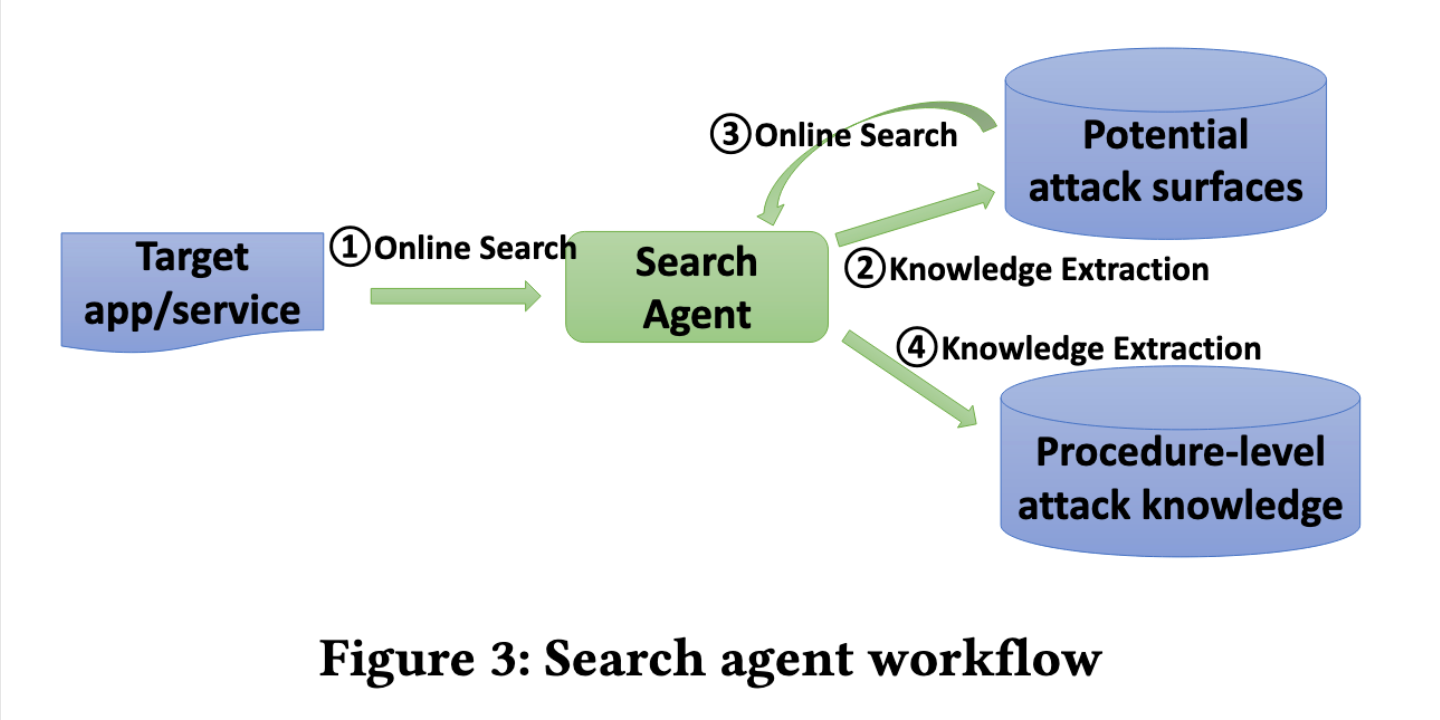 搜索代理将目标服务和应用程序作为输入,并将相关攻击知识存储到数据库中作为输出。搜索代理对相关信息执行两轮分层在线搜索。在第一轮中,它搜索和分析结果,以提取与目标相关的潜在攻击面。在接下来的一轮中,它使用已识别的潜在攻击面作为搜索和分析攻击知识的指南。潜在的攻击面和攻击知识存储在两个独立的数据库中,以备将来使用。