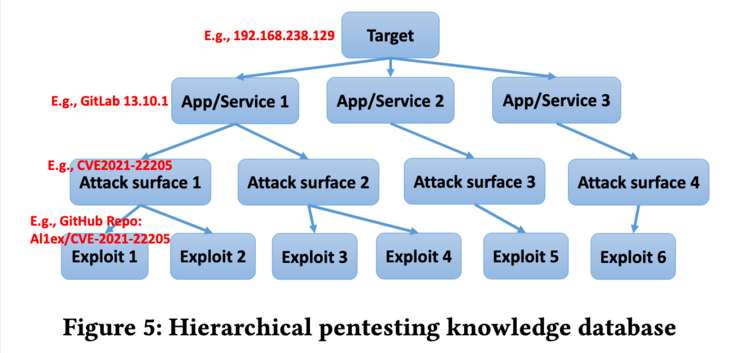 - 漏洞分析:搜索 Agent 查询环境信息数据库,以检索目标主机上公开的服务和应用程序列表,在这些服务和应用程序的指导下,搜索潜在的攻击面和过程,并将它们保存在单独的数据库中;计划 Agent 首先利用 RAG 技术查找潜在攻击面列表,并使用这些已识别的攻击面来确定针对目标环境的适当攻击