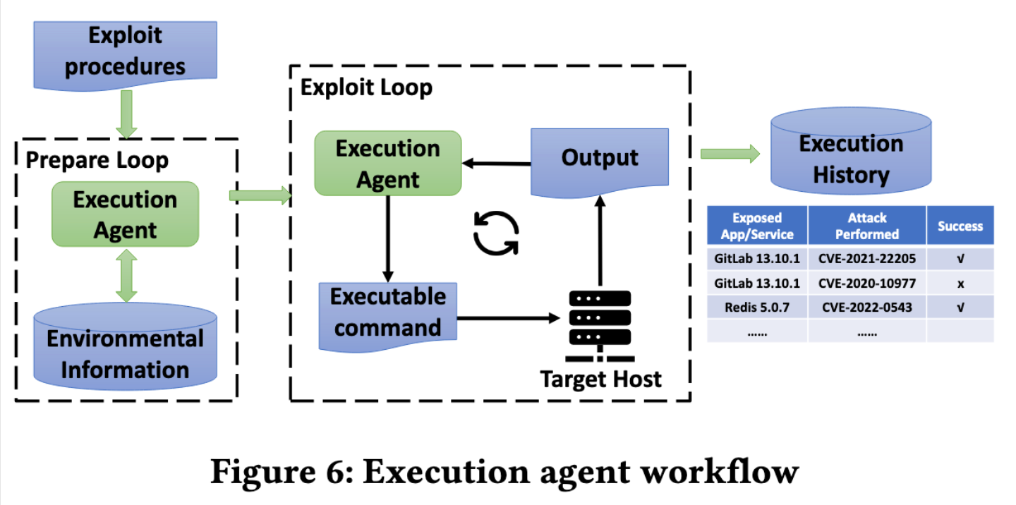 在开发阶段,执行 Agent 使用 RAG 获取代码执行的详细信息,分解执行计划,并生成分步执行指南。与侦查 Agent 类似,执行 Agent 参与迭代循环来执行漏洞利用。