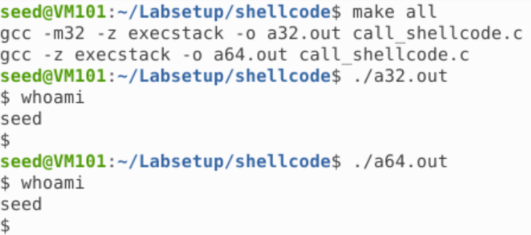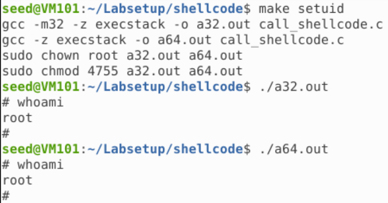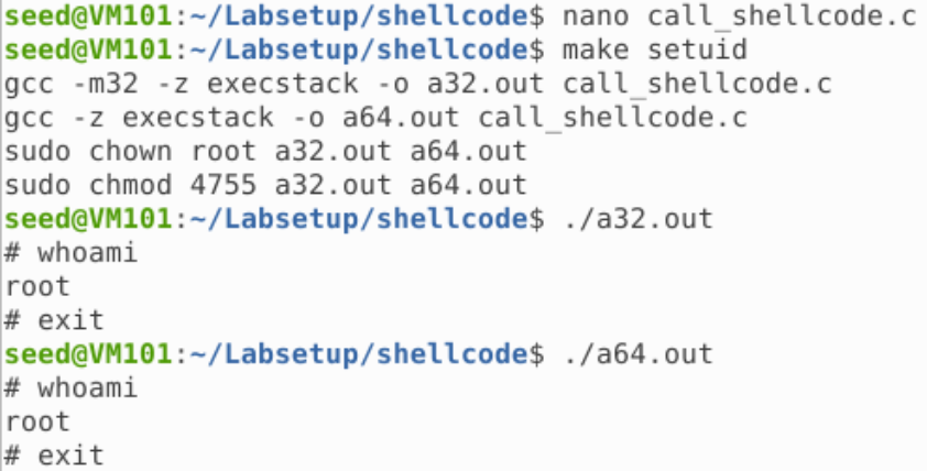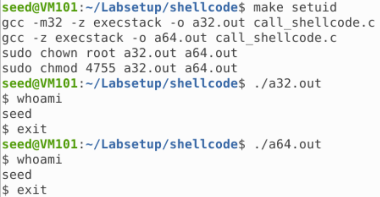 可以看到,两个程序都成功获取了 seed 权限的 Shell,如果用 setuid 方式编译:
