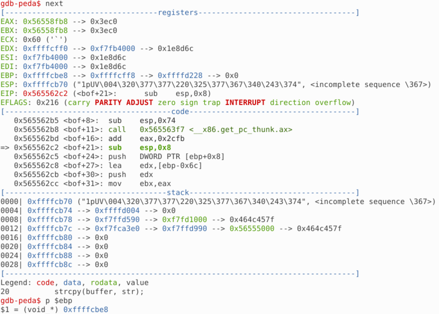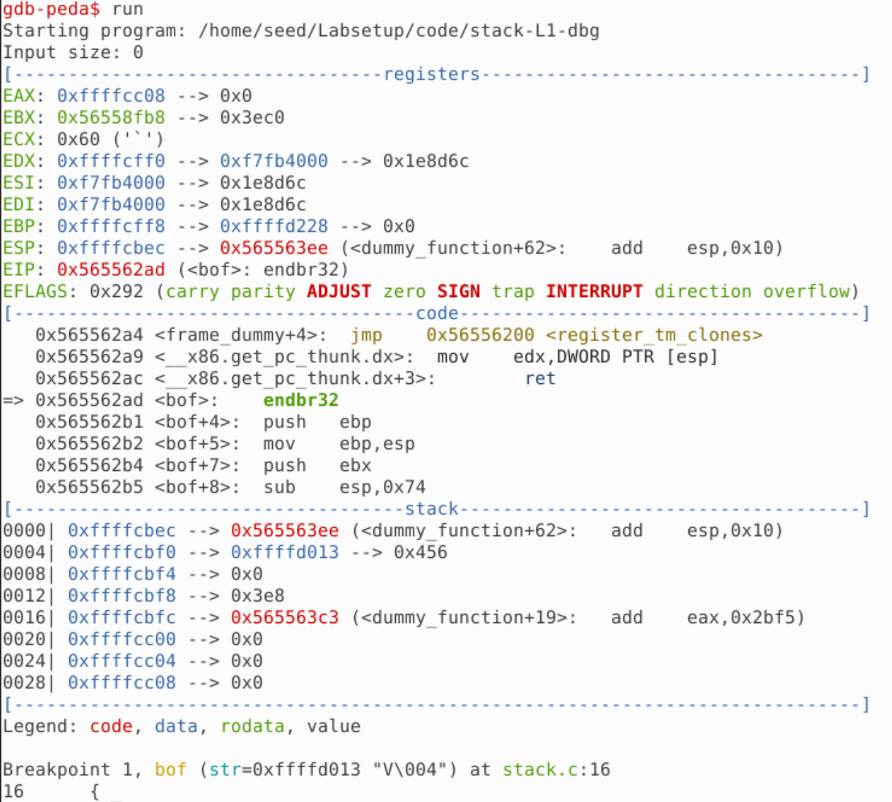 而我们想获得 bof() 函数的基址,需要先让程序执行到 mov ebp,esp 之后: