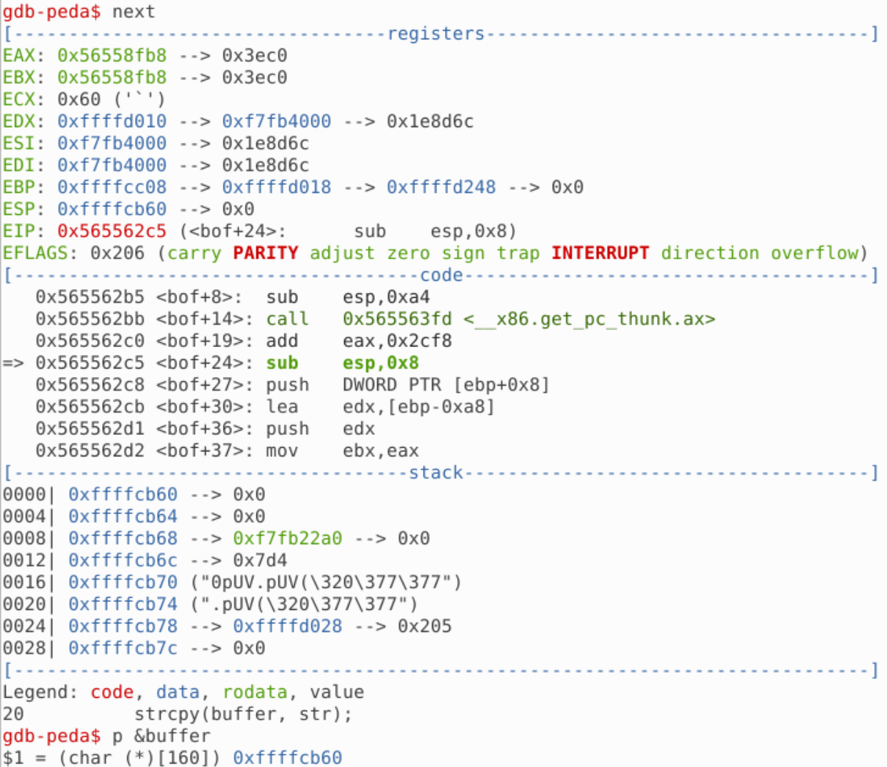 此时获得的就是 bof() 函数的基址,然后也可以获得 buffer 的起始地址: