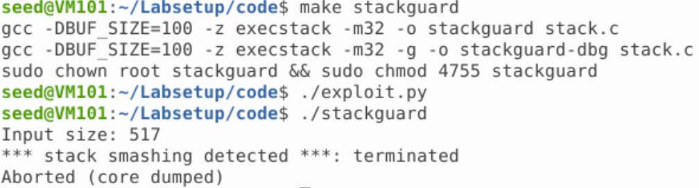 可以看到,程序运行失败了,说明 StackGuard 检测到栈溢出成功地阻止了攻击
