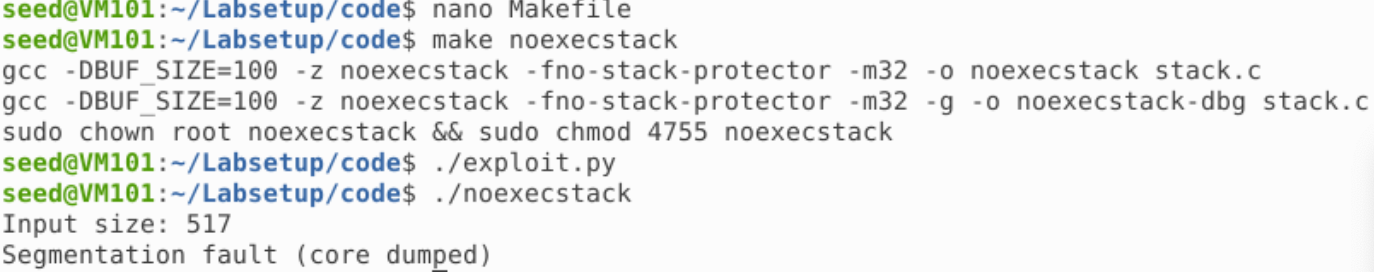 可以看到,程序运行失败了,说明不可执行栈让代码不能在栈上执行,成功地阻止了攻击
