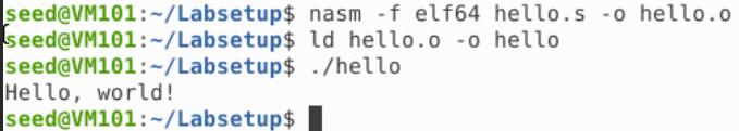 利用命令行 nasm -f elf64 hello.s -o hello.o 编译汇编代码,用 ld hello.o -o hello 链接生成可执行文件,运行 ./hello: