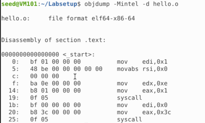 利用 objdump -Mintel -d hello.o 来反汇编,-Mintel 选项表示生成 Intel 模式的汇编代码: