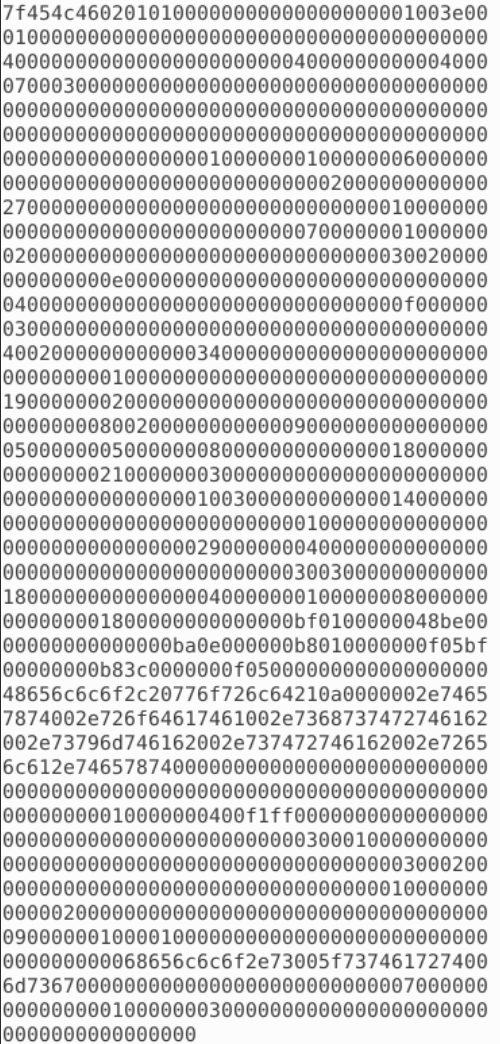 用 xxd -p -c 20 hello.o 命令打印二进制文件的内容:
